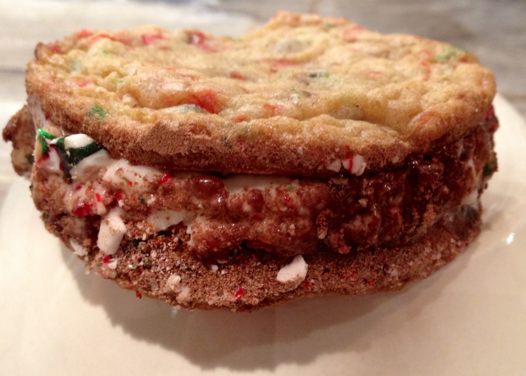 A festive dessert! Add crushed candy canes to your favourite chocolate chip cookie recipe. But for ice cream sandwich cookies under cook the cookie by a minute or so. Once the cookie is cooled, add ice cream to the middle of 2 cookies. And roll it in crushed candy canes and chocolate. Voila. A candy cane ice cream sandwich!