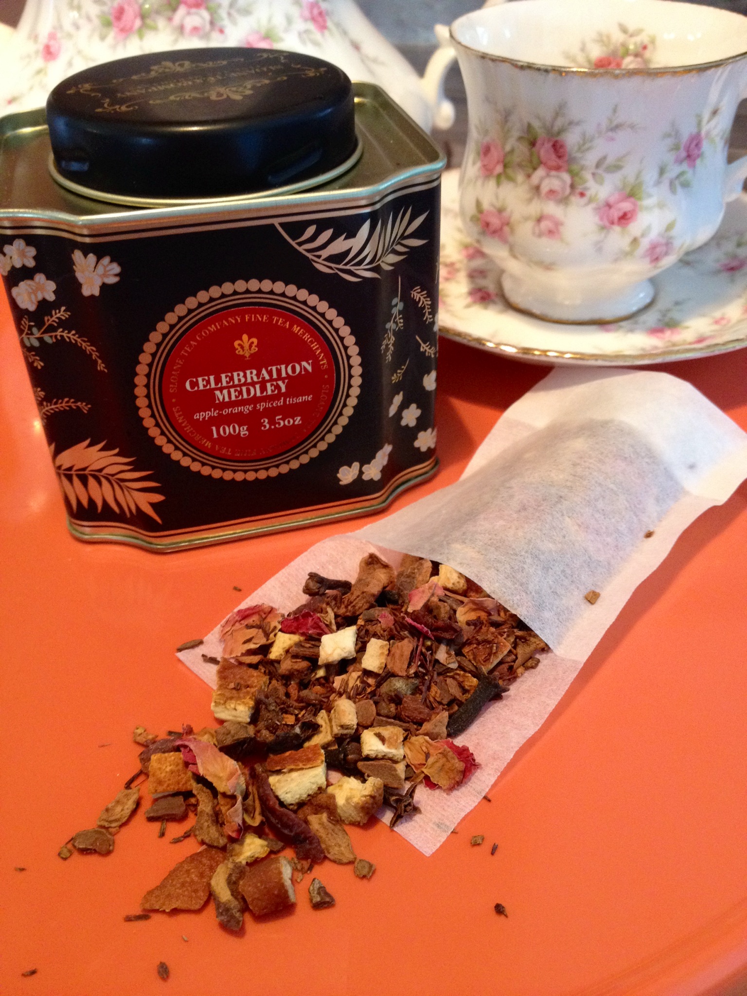 I love this flavour so much; Celebration Medley is a seasonal holiday tea from Sloane Fine Tea Merchants. It’s a delicately sweet apple-orange spiced tisane that warms your body and soul with the comforting aroma’s of apple, orange and rose with hints of cinnamon, clove and nutmeg.I found it at the Blackbird Tea Shop while exploring the distillery district in Toronto. I don’t drink coffee, and for the longest time hot chocolate (made with milk of course) was my drink of choice. However, after receiving a cute china tea set as a gift I’ve been exploring the world of tea (especially afternoon/high tea.) But most of all, I’m really enjoying the process; boiling, steeping, sipping it keeps me grounded. And for Christmas this year this is what I shared with my friends and family, Sloane Tea’s Celebration Medley: Tea’s the season!