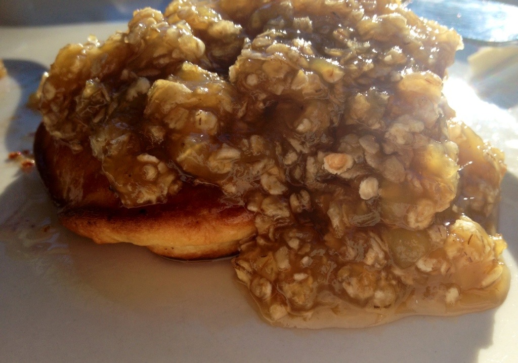 Today I kept it simple topping my blueberry pancake with banana oatmeal crumble. I make the instant oatmeal but substitute the water with crushed bananas, a little bit of brown sugar and maple syrup. It is such a warming breakfast! Or you could use applesauce instead of water too.