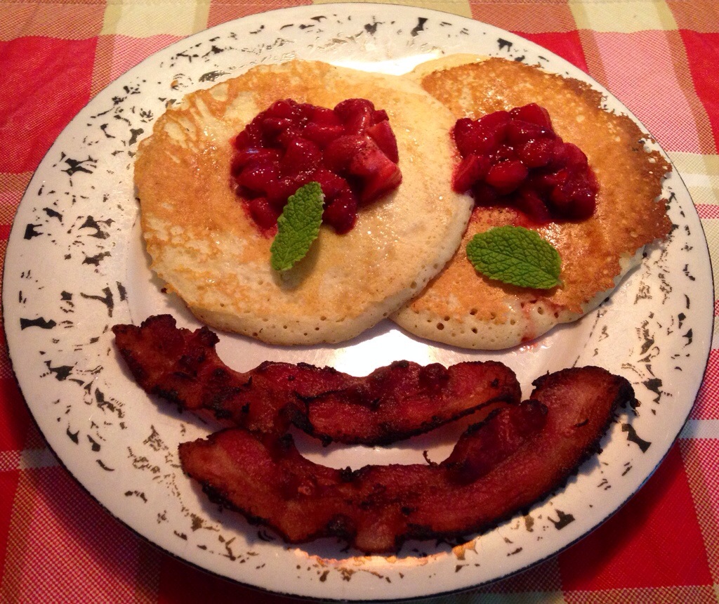 I always make extra pancakes and freeze the extras for easy drop in the toaster the next day. One day I had maple syrup and the fresh strawberries on top (boiled for a few minutes with lemon and sugar) and the next day I topped them with Greek yogurt and strawberries paired with a lovely cup of earl grey tea.