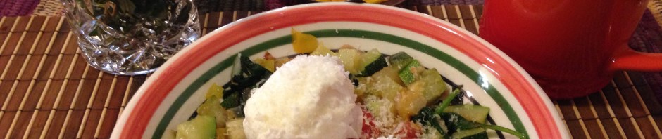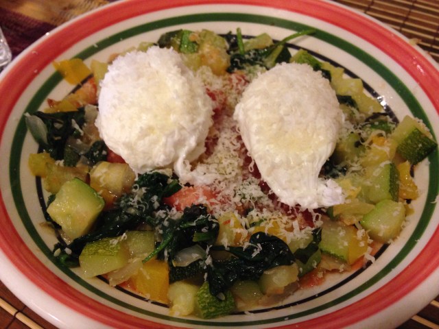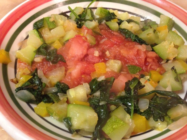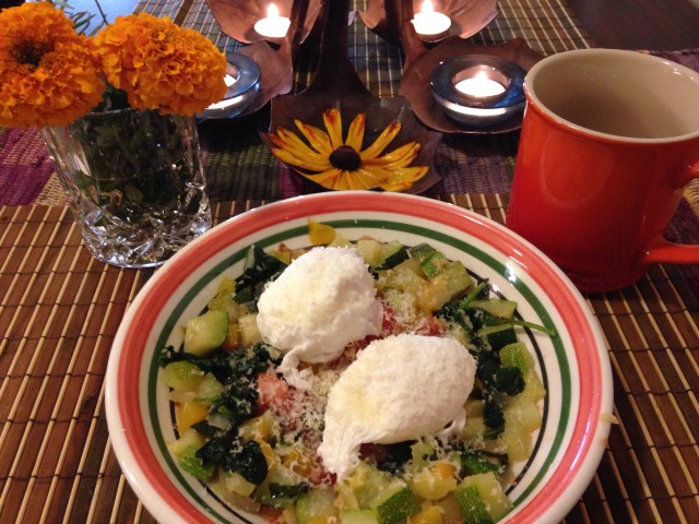 I’m sharing this not as a step-by-step recipe, but as an inspiration for you to use whatever local ingredients you have access to. I sautéed onions and garlic in grape seed oil, added cubed zucchini picked fresh from the garden along with chopped peppers and spinach. After a few minutes I added half a tomatoe to the middle of the sauté pan.