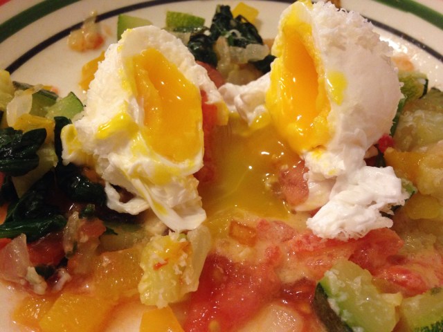 With all the fresh vegetables readily available I want to incorporate vegetables into my every meal. Poached eggs on garden veggies is a great and simple transition for incorporating veggies into your breakfast because it’s fast, warm and I still get to have my favourite poached eggs!