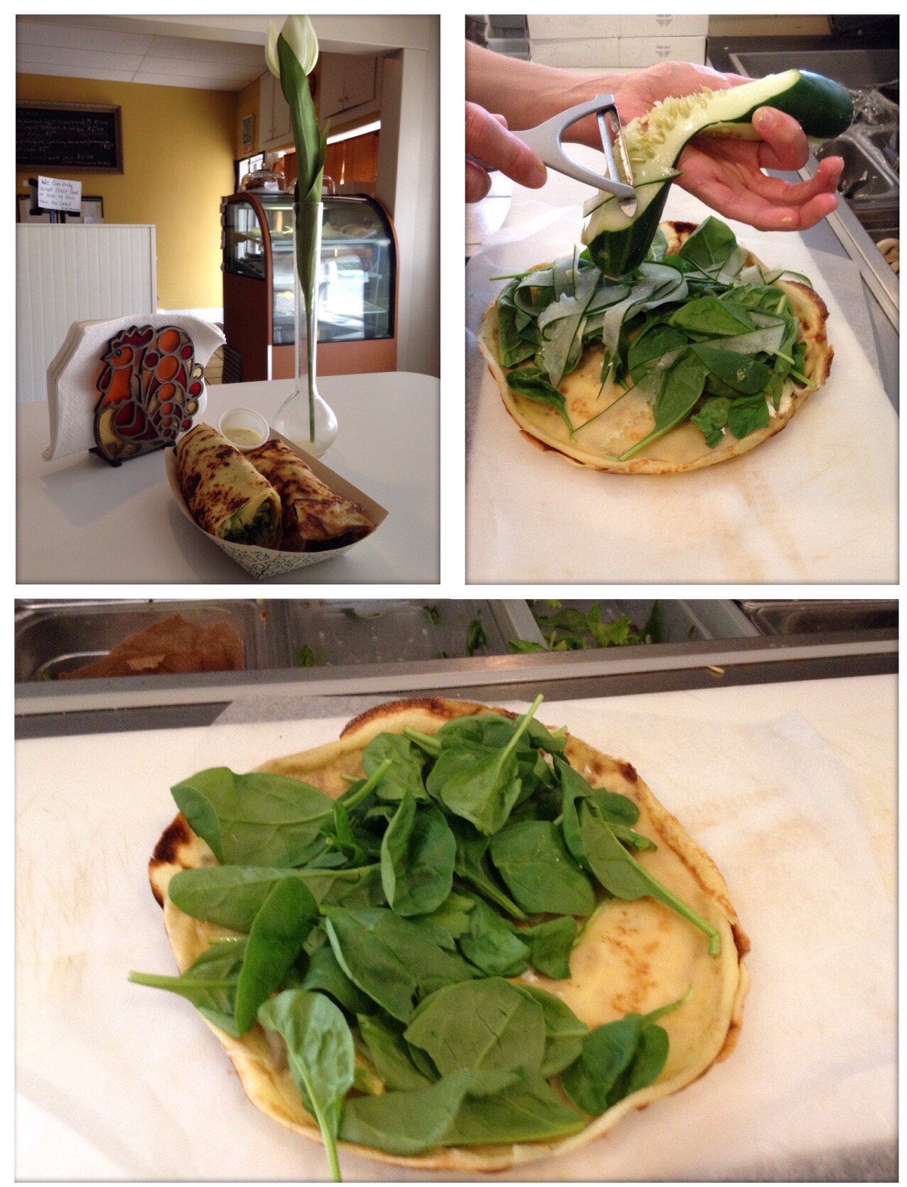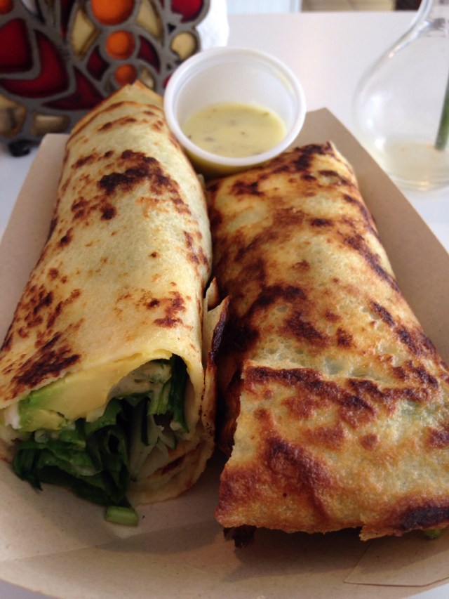 She picked perfectly for me, the “Fresh Crepe” with spinach, feta, cucumber, avocado and amazing homemade garlic sauce.