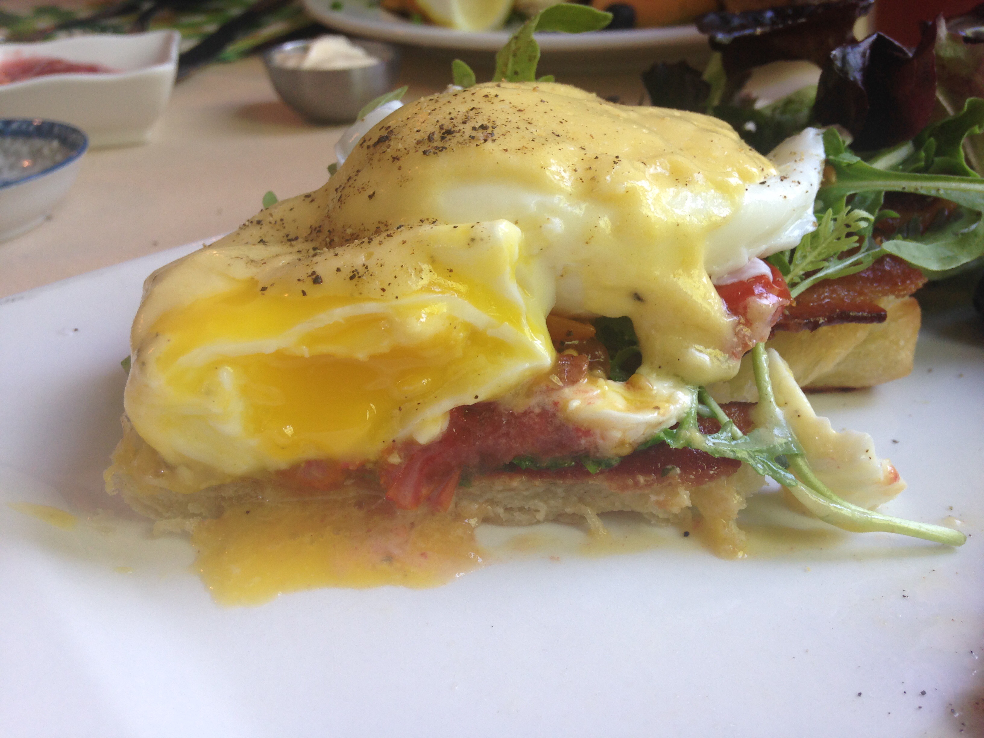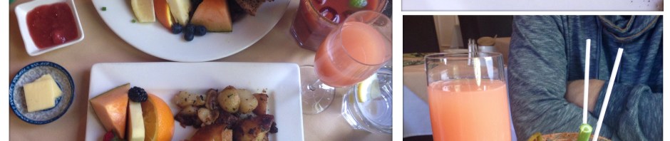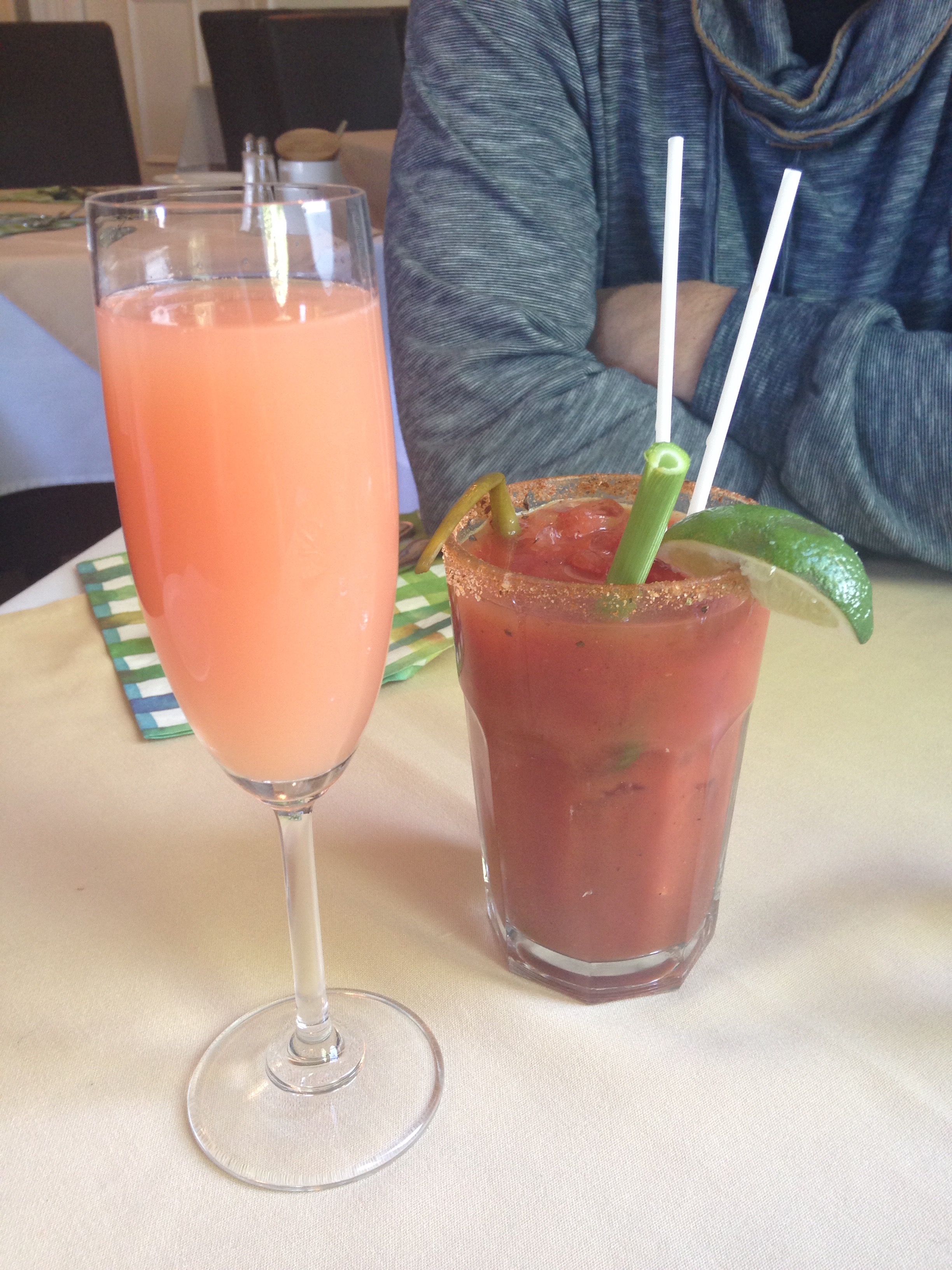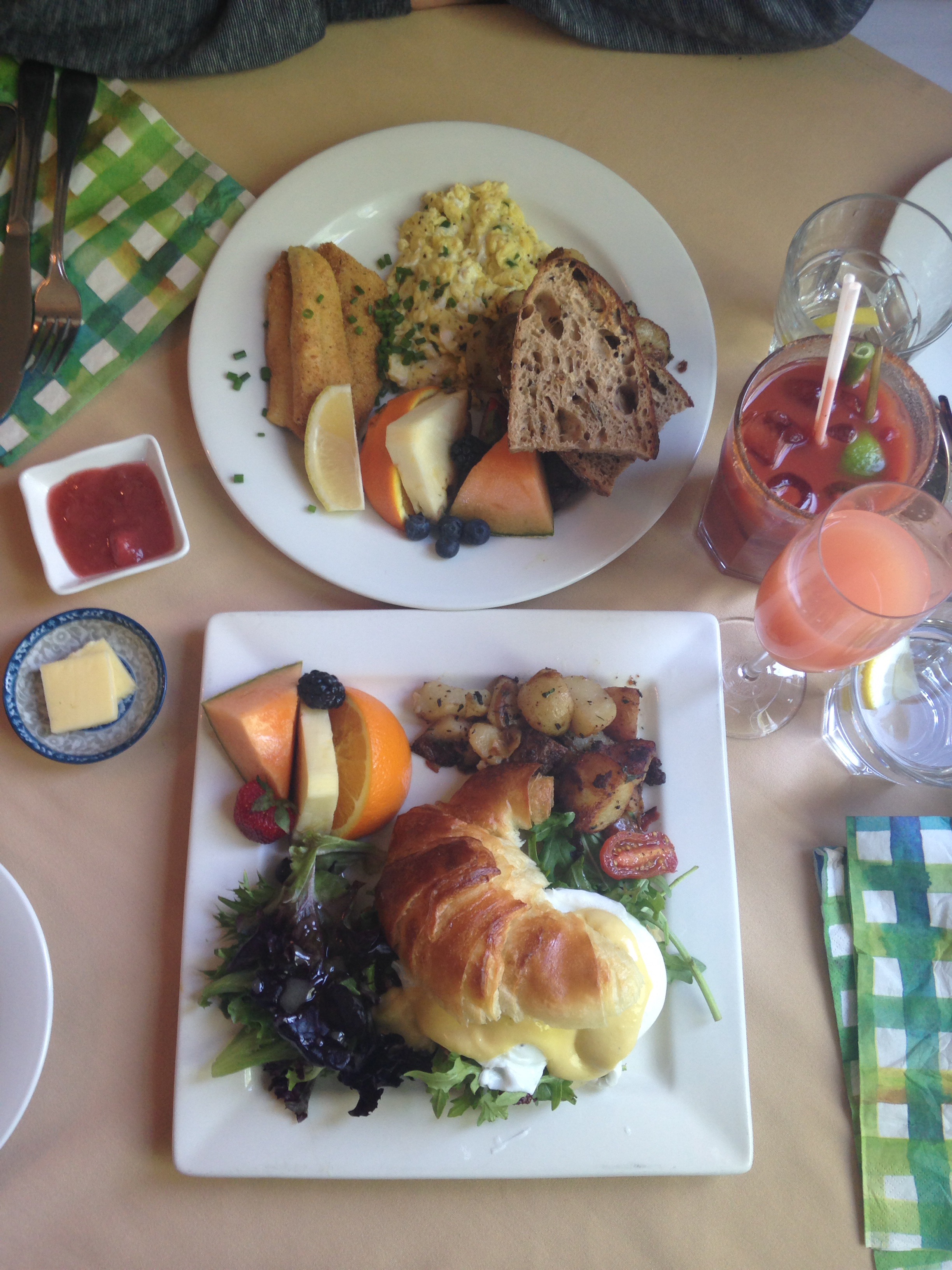 Bubbly drinks and Caesars with breakfast; poached eggs covered in sweet hollandaise sauce on top smoked bacon and a flaky croissant; soft scrambled eggs & chives with cornmeal crusted perch; all with perfect home fries.