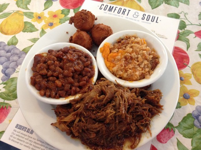 I started with the Southern style BBQ pork dinner. There are 2 kinds of sauces: Comfort sauce – bourbon & brown sugar. Soul sauce – smoky BBQ. It’s recommend to have both as they are meant to go together. So of course I went with the advice.