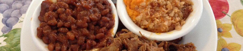 1/2 lb pulled pork. 3 sides: sweet potato casserole. Baked beans. Hush puppies (deep fried corn bread)